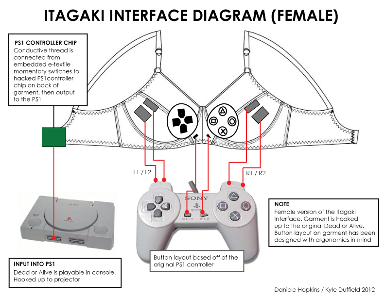 Itagaki Interface is both a playful interactive performance piece and a social experiment that aims to complement and contrast the content of “Dead or Alive” (DOA) through the tactile manipulation of the PS1 interface. Itagaki Interface features two performers/artists acting as female and male “controllers,” each wearing a hacked PS1 controller bra/bro. The controllers are connected to the first installment of DOA, the beginning of the Tecmo-saving franchise created by Tomonobu Itagaki, which was renowned for its impossible-looking implementation of the series’ controversial trademark breast physics. The game is projected so that the characters in the game are relatively life-sized, with both artists standing static in front of the screen. Participants are invited to “play” the artists, free to select either a male or female controller (versus or single player), and subsequently, a male or female fighter within the game. Face to face with the artists, participants engage with awkwardly tangible human intimacy while controlling a now archaic 32-bit representation of fantastical and sometimes oddly bouncy bodies.