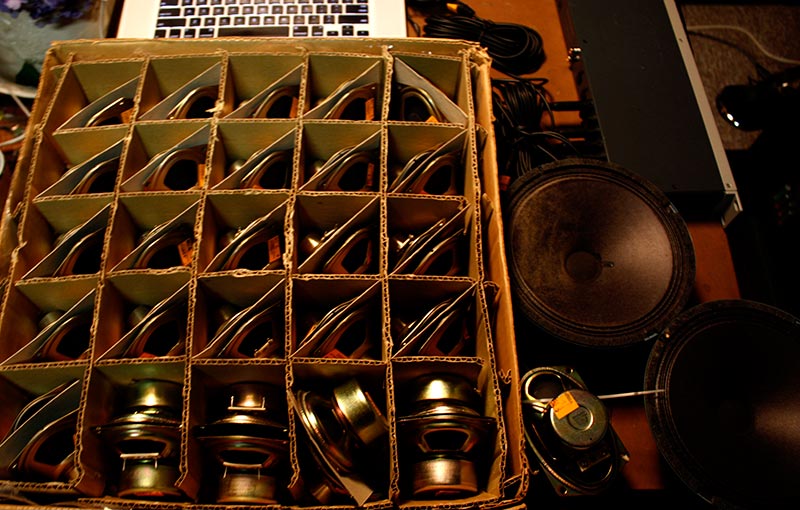 Since our goal is to produce a multi-channel soundscape for participants to explore, rather than a more traditional sound, we decided to stick to uniformity and employ a huge pile of cheap loudspeakers, most often used in car radios. Then we’re adding a couple of woofers to the top and bottom to give it some balls. As seen above, we got ourselves 52 loudspeakers to make up the body of the hive, and were donated a couple of woofers. Overall, Hive is looking to have 50 speakers in total – 48 plus the two woofers.