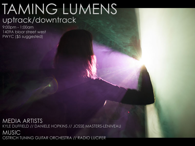 This story begins with Kyle’s interactive light-sound installation, Trace, being selected to be a part of this year’s art portion of NXNE. It was fun: we filled Hashtag Gallery with fog and everyone got a chance to create and control conical light sculptures out of solid beams of light. Unfortunately, in the haziness of the environment someone snagged Kyle’s borrowed DSLR camera (with its lenses) when he put it down to give a demonstration of the piece. We lost all of the documentation of the event, so the fine folks at the new space uptrack/downtrack and some friends figured instead of wallowing in the loss, we’ll just create an evening of new memories instead.