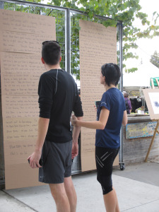 For market buzz this morning, overheard fragments of conversation were transcribed on panels displayed on the courtyard’s chain-link gate.