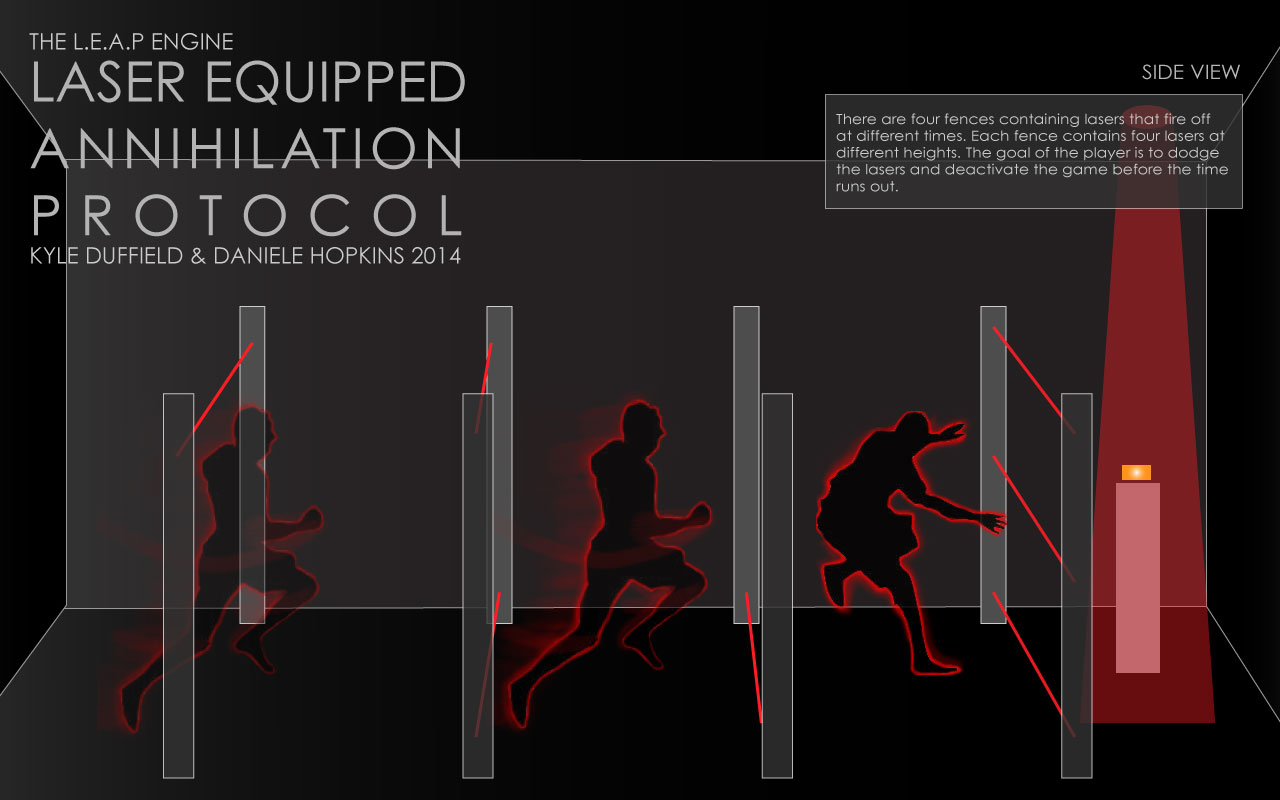 Daniele Hopkins and Kyle Duffield side view diagram for their laser-avoidance installation game, The Laser Equipped Annihilation Protocol (or The L.E.A.P. Engine)