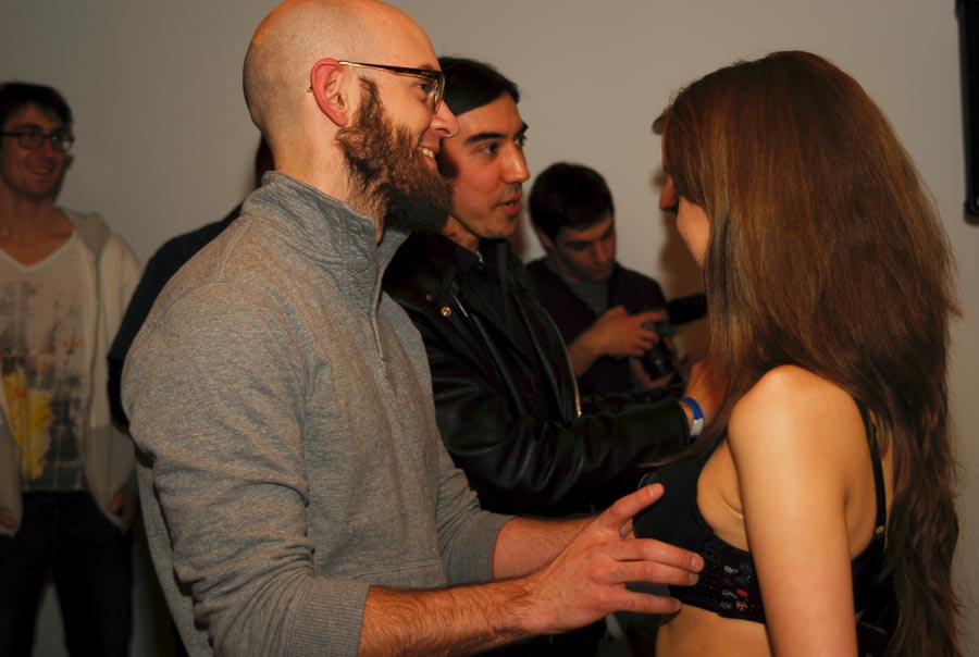 Audience members playing Dead or Alive on Kyle Duffield and Daniele Hopkins’ working PS1 controller bra and bro/mansierre at Vector Game + Art Festival on February 22nd, 2013